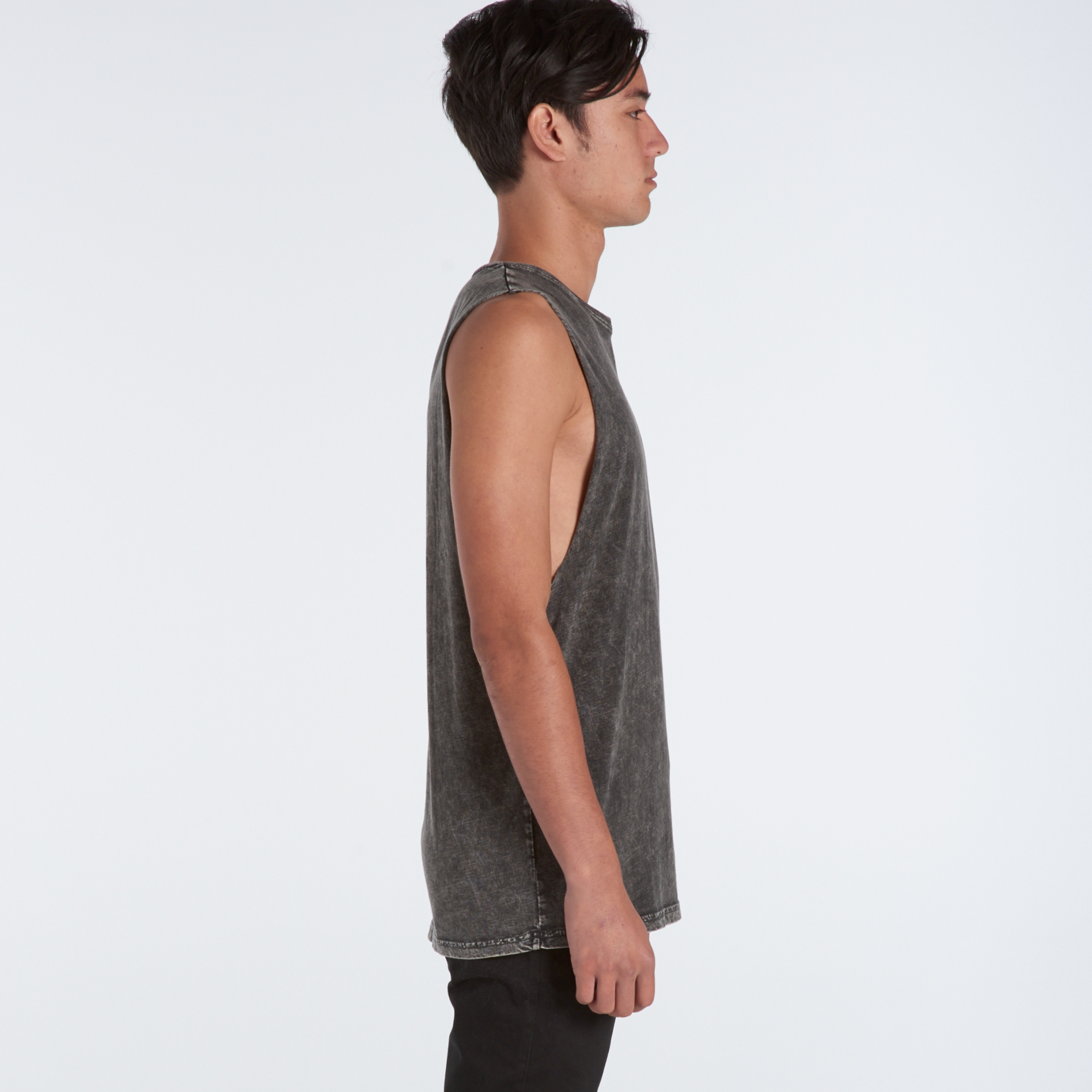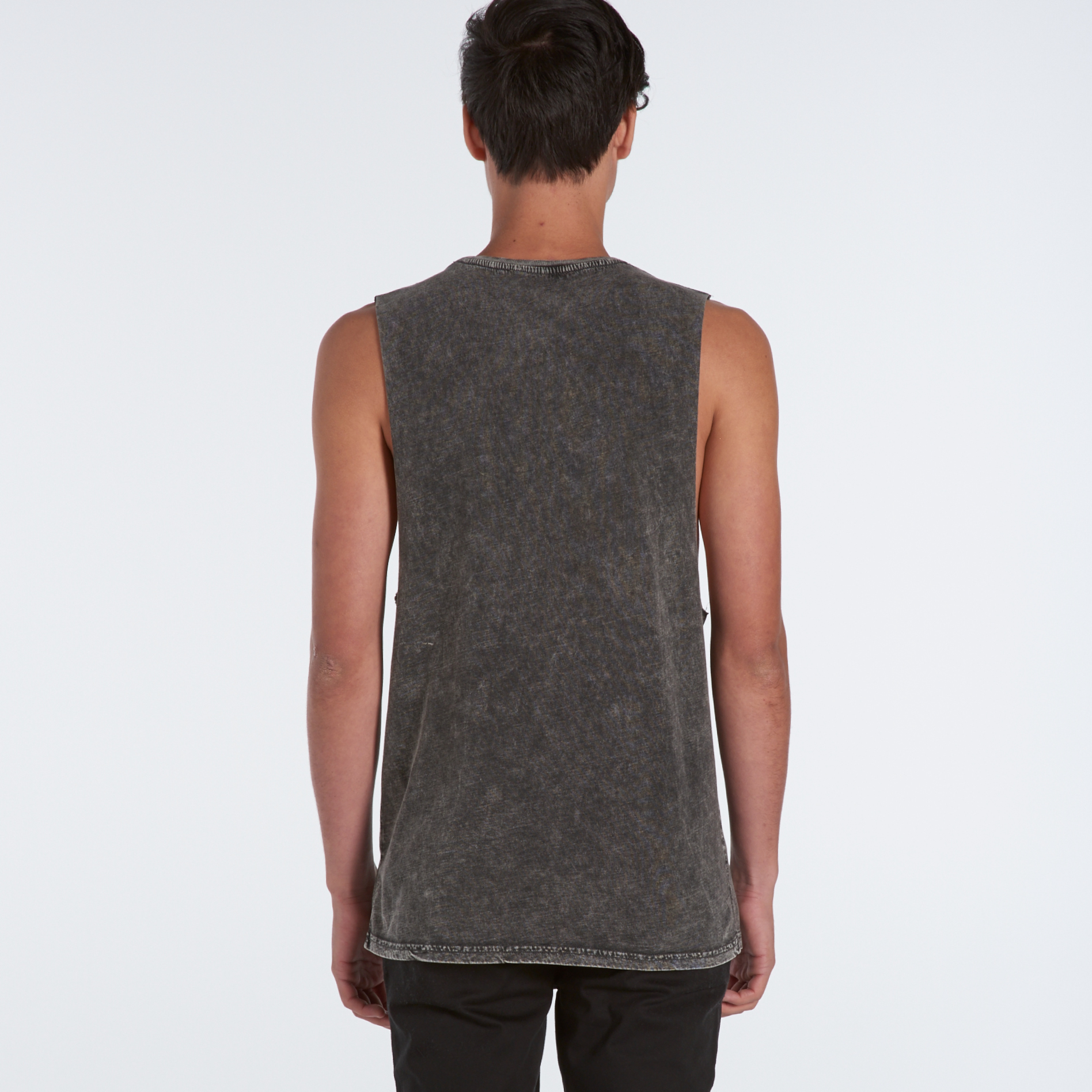 Sleeveless tank, raw armhole edges, stone wash finish with a worn look